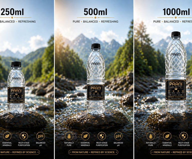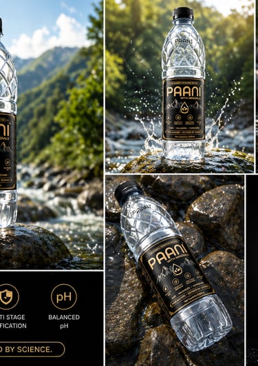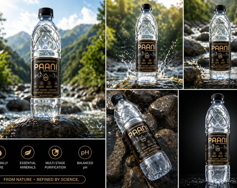 Refreshing water poured into a sleek bottle with a natural spring background.